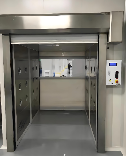 貨淋室是貨物進入潔淨室前進行表面淨化的專用通道設備,通過物理隔離與氣流淨化相結合的管道减少污染物進入潔淨區域。 其覈心功能由雙門電子互鎖裝置形成氣閘效應,配合初效及高效過濾系統(過濾效率≥99.99%)實現空氣迴圈淨化,可旋轉噴嘴以22-26m/s風速多角度清除貨物表面塵埃粒子。