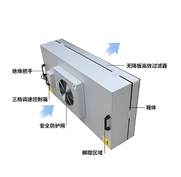 直流FFU(風機篩檢程式單元)由無刷直流電機、高效篩檢程式(HEPA/ULPA)和智慧控制系統組成,其工作原理為:風機從頂部吸入空氣,經高效篩檢程式(過濾效率99.99%以上)淨化後,以0.45m/s±20%的均勻風速送出潔淨空氣,維持局部百級(ISO 5級)或更高潔淨度。