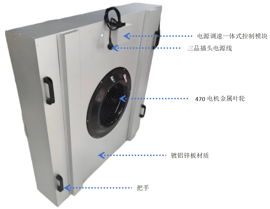 FFU(Fan FilterUnit)風機過濾機組是壹種自帶動力的空氣過濾淨化單元,它由初效過濾器、特種風機、高效過濾器和靜壓箱組成。空氣經兩級過濾器過濾後的潔淨空氣以0.45m/s±20%的風速均勻速送出。具有低噪音、低能耗、震動小、可調速、免維護及安裝方便等優點,可模塊化組裝拼接使用,是目前潔淨廠房理想的淨化裝置之一。